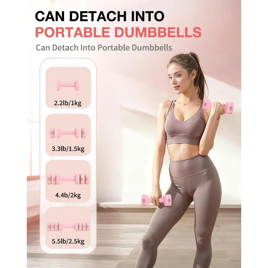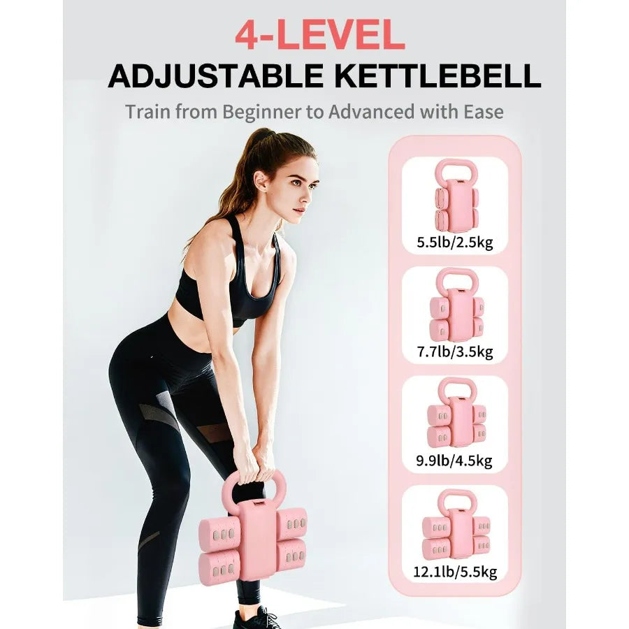 - 9 weight configurations adjust to 2.2 lb, 3.3 lb, 4.4 lb, or 5.5 lb per dumbbell, plus a 1.1 lb kettlebell base for a total range of 5.5–12.1 lb.